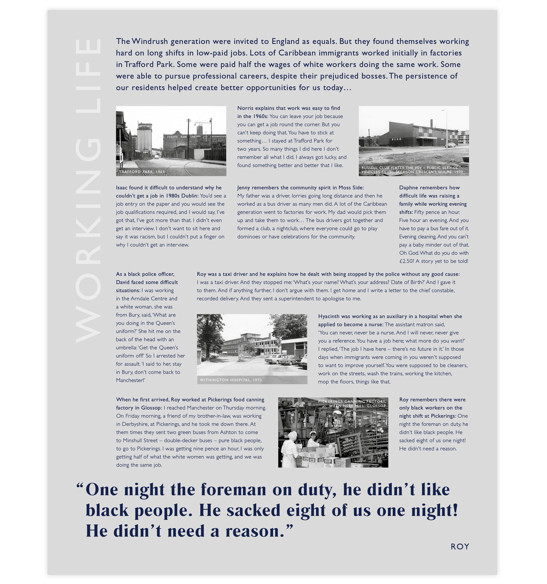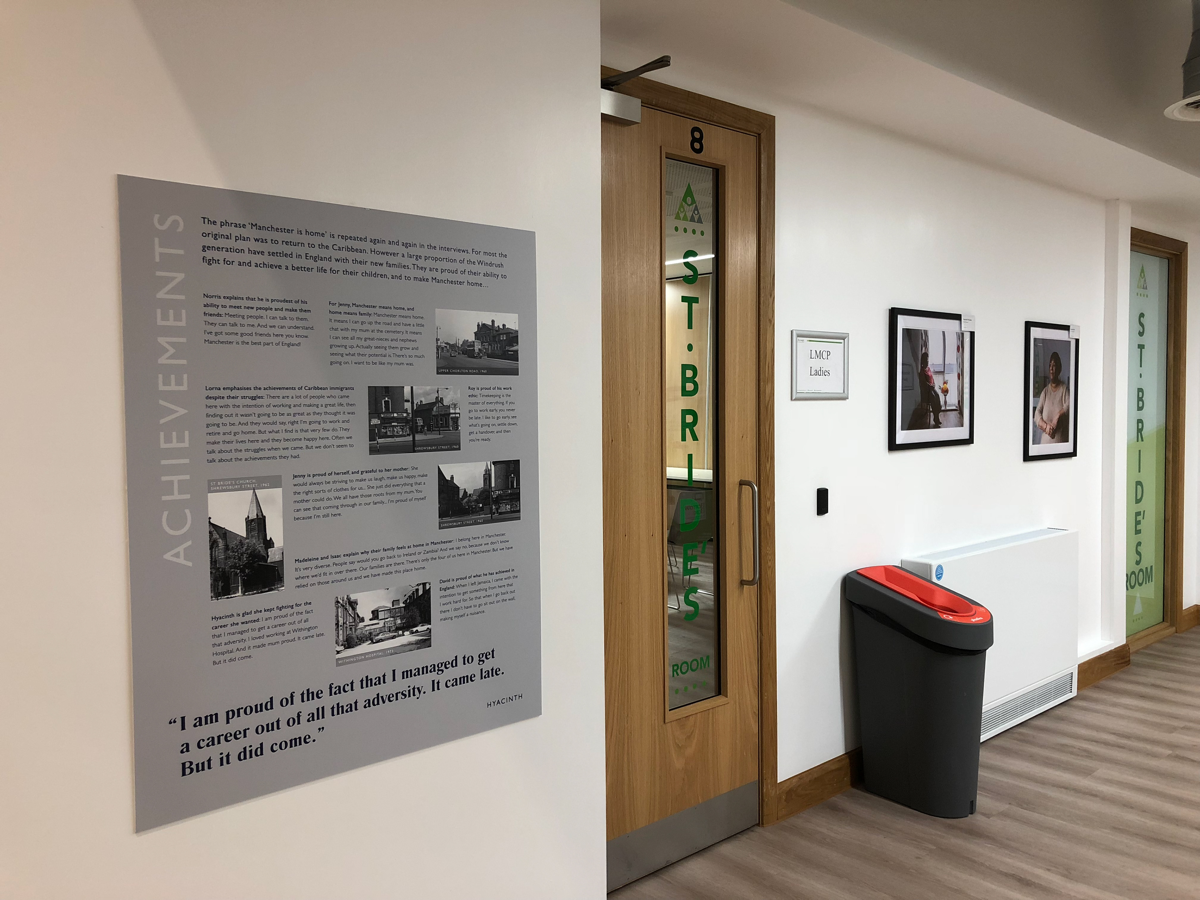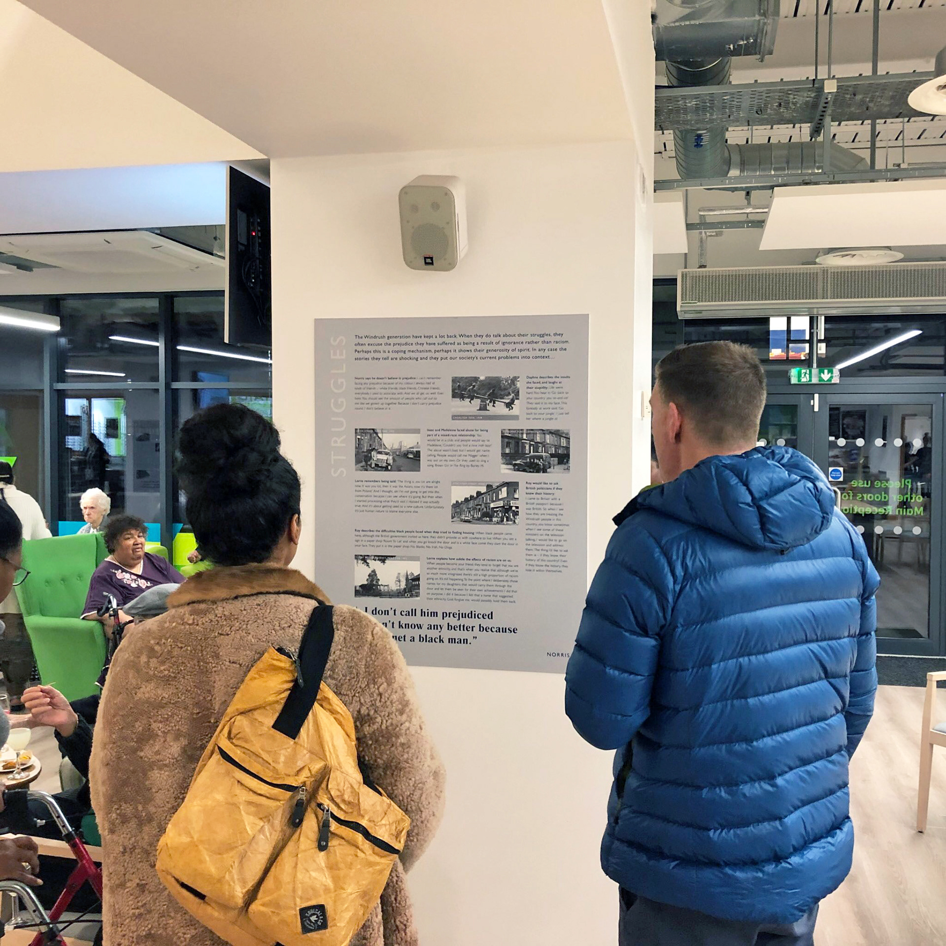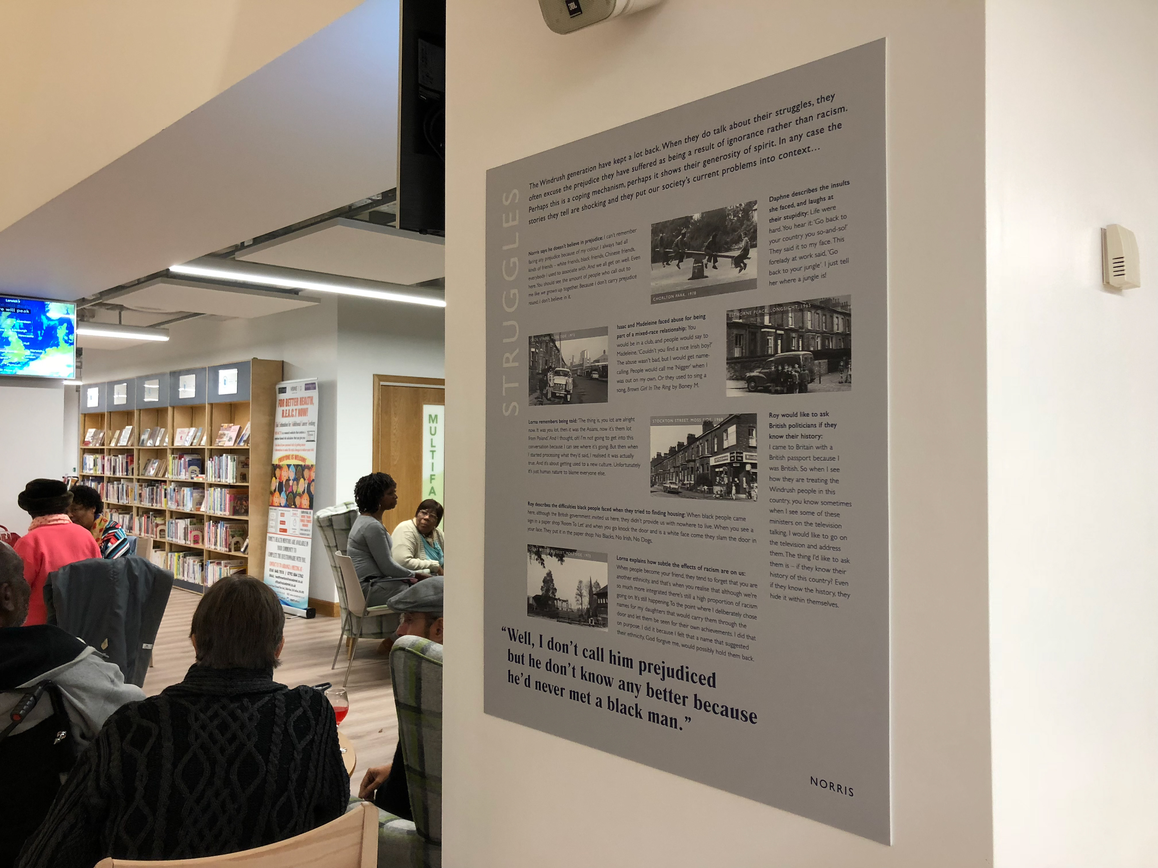 The exhibition is displayed all around the ground floor of Limelight along with portrait photography by Rik Jundi. Despite there being a lot text to be included, the exhibition setting also houses a Cafe, Library, meeting rooms and access to other services, so has a large footfall and areas where people will be for longer periods of time.