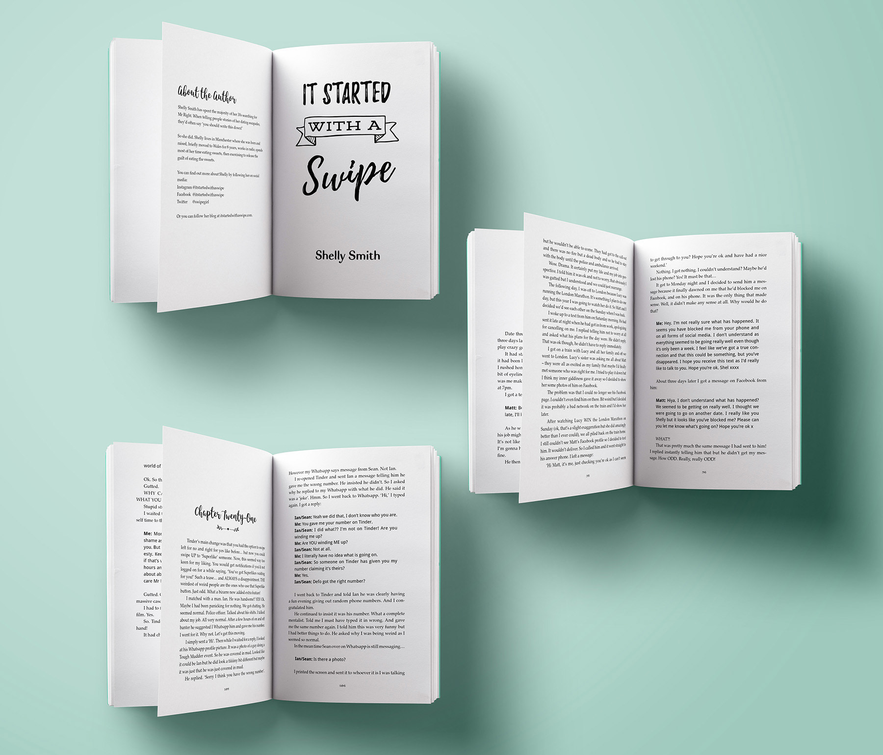 It Started With A Swipe is a real-life memoir of a 30-something online dater with all it's trials and tribulations. I was commissioned by Shelly to design and lay out her first book.