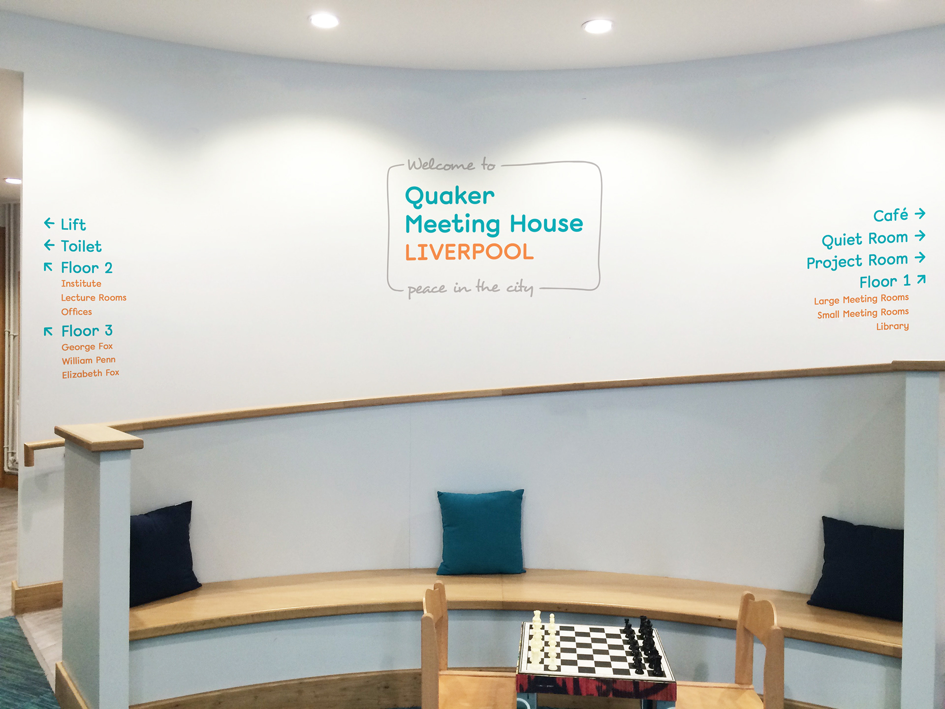 I chose a simple and modern approach with colours inspired by furnishings in the entrance foyer. Rounded elements ensured the brand remained friendly and reflected the community and not-for-profit focus of the Quaker values.