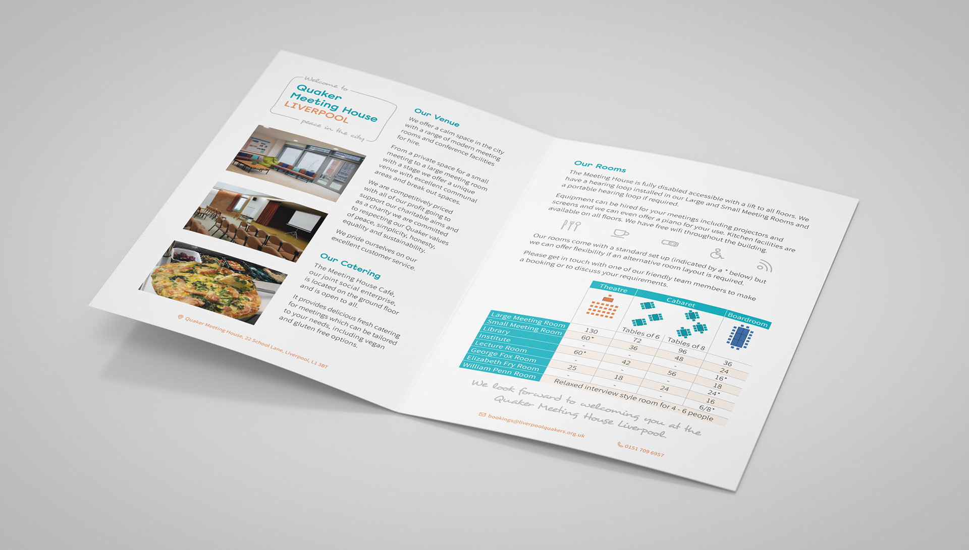 The venue, which also served as a base for the Quakers in the area, offered a variety of well-appointed spaces for hire. The modern interior and venue hire offering was not reflected by the mismatched collateral.